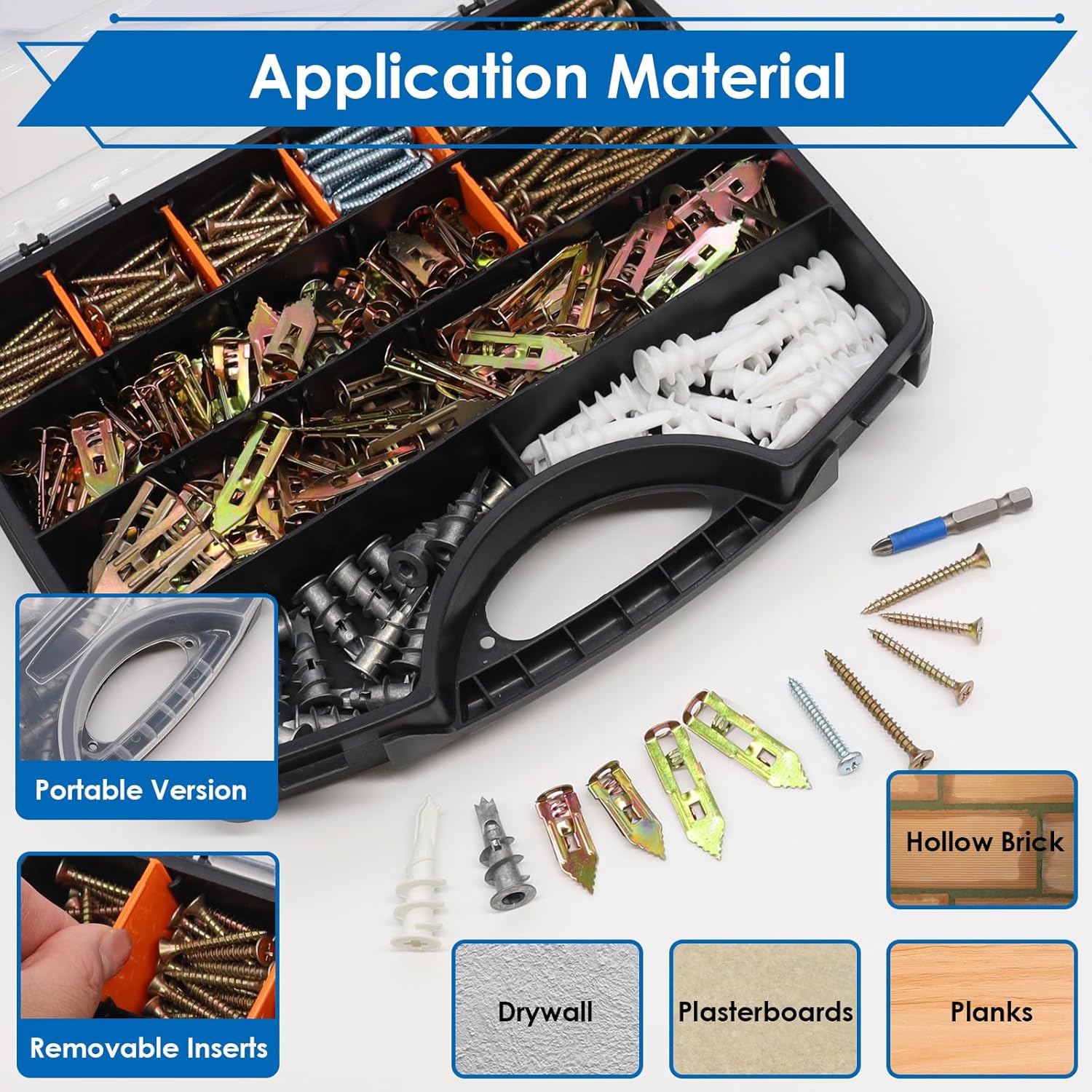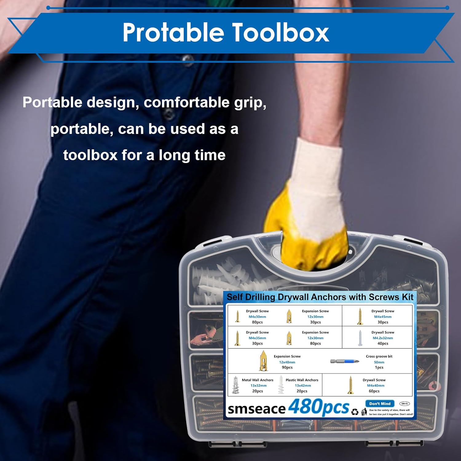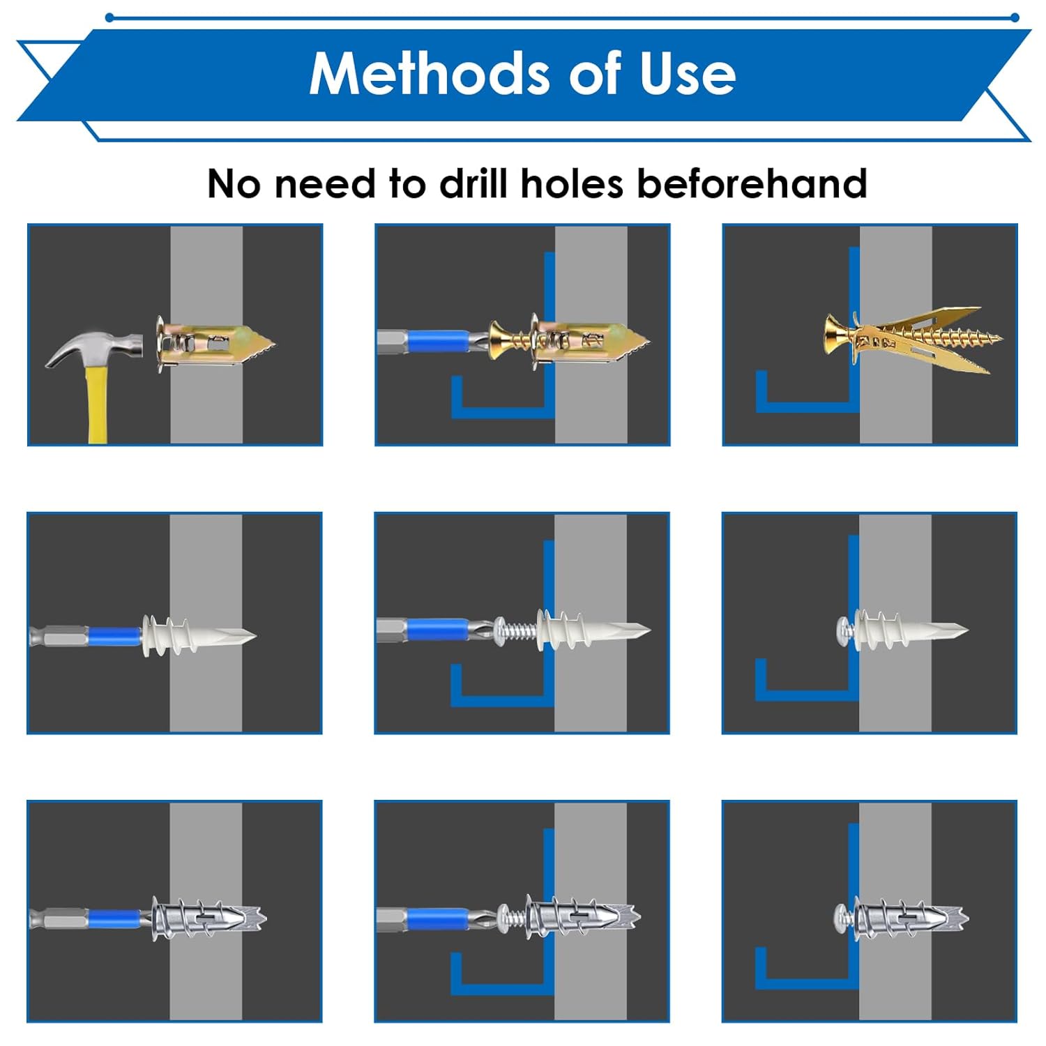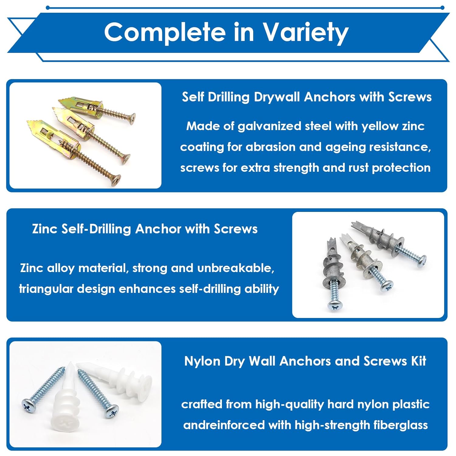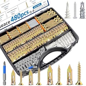 smseace 480Pcs Self Drilling Drywall Anchors 4-Sizes Zinc Plated Steel and Plastic Sheetrock Anchors and 5-Sizes Self Drilling Anchor Screws Used for Hanging Picture Frames, Curtains, Plants, Clocks