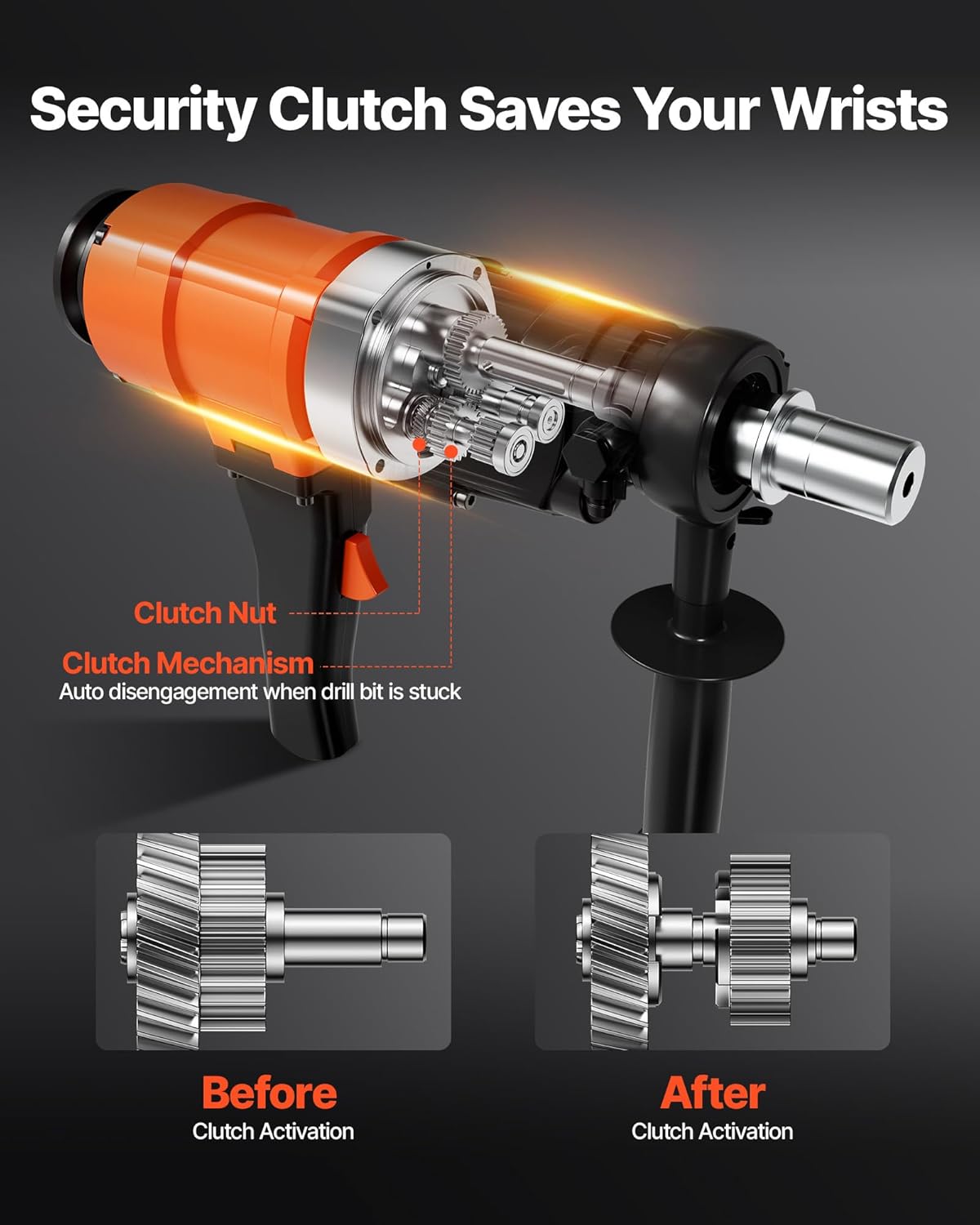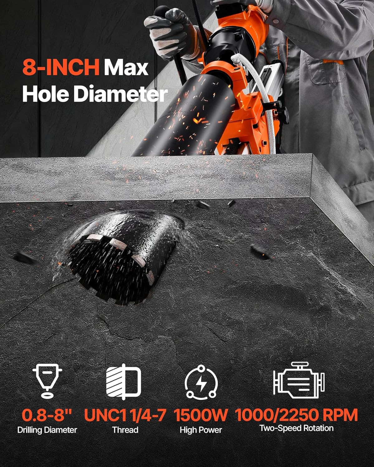 VEVOR Diamond Core Drilling Machine, 8 in Drilling Diameter, 2-in-1 Handheld & Stand-Mount Dry and Wet Concrete Core Drill Rig with 4 Drill Bits, 1075/2300 RPM 2-Speed, for Concrete Brick Stone, 1800W